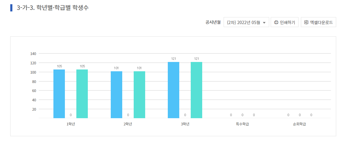 (참조) 항목별 공시 정보 - 학교명 검색 -공시정보 "작년도 선택 " - 학생현황 - 학년별 학급별 학생수